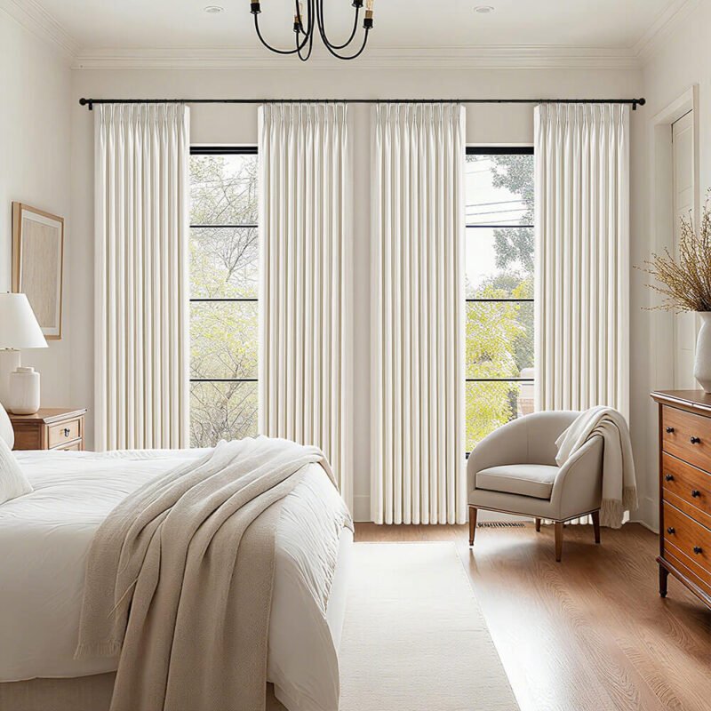 10 collections with 800 neutral fabrics, 10 header styles, and 2 liners—blackout thermal and noise-reduction. Memory-shape training makes each drape unique.