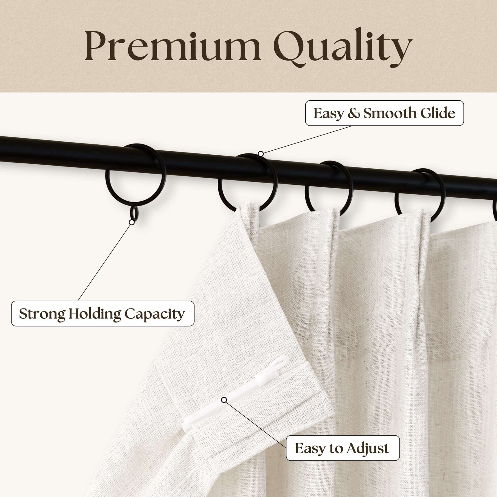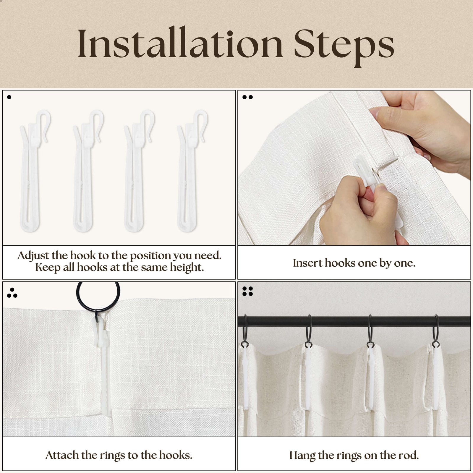 Elevate your pleated curtains with this complete set of 16 adjustable hooks and 16 metal rings. Designed for easy installation, they fit rods up to 1.25 inches, with hooks that adjust up to 2.7 inches for perfect pleat control. Crafted from durable materials, they provide reliable support and add elegance to any window setup. Ideal for creating a polished, functional look in any space.